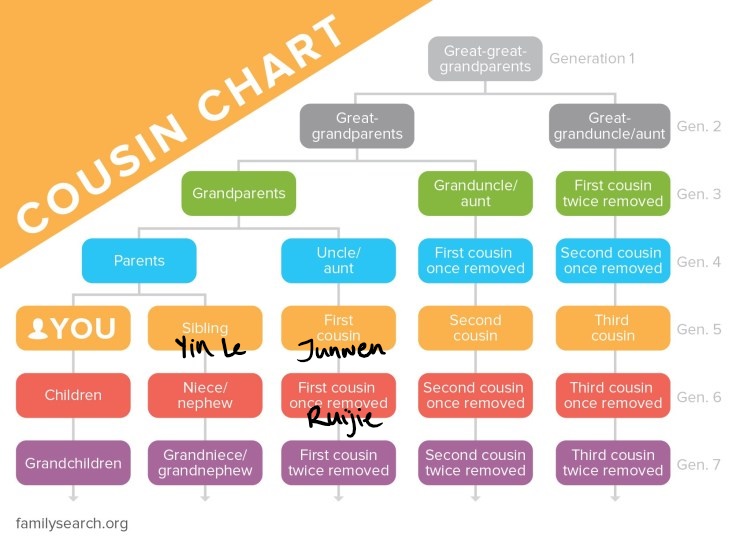 Anyone else have trouble remembering the 1st/2nd/3rd cousin once/twice/thrice removed thing? Me too. Here’s a handy diagram: